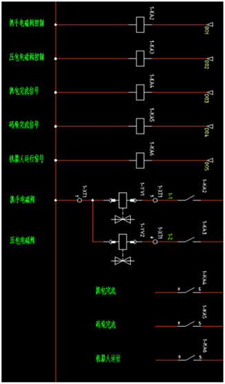 前三個為氣缸磁性開關檢測信號,后兩個為配套PLC傳送給機器人大包和托盤準備好的信號,為了實現電氣隔離,需要將PLC給機器人的電平信號轉化為機器人自身的電平,需要通過繼電器來實現。